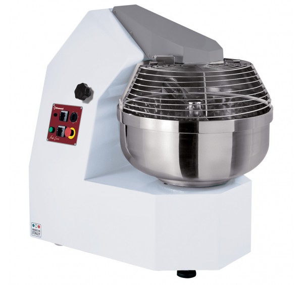 70 literes villás dagasztógép, 60 kg tésztakapacitással, 660 mm átmérőjű és 330 mm mélységű rozsdamentes acél dagasztócsészével, 31 mm átmérőjű rozsdamentes acél dagasztókarral, 2 sebességgel (19 vagy 29 fordulat/perc), mechanikus vezérléssel, időkapcsolóval, vészleállítóval, üstkaparóval, rozsdamentes acél védőráccsal, biztonsági mikrokapcsolóval, festett acél burkolattal, elöl szintezhető talpakkal, hátul két fix görgővel.