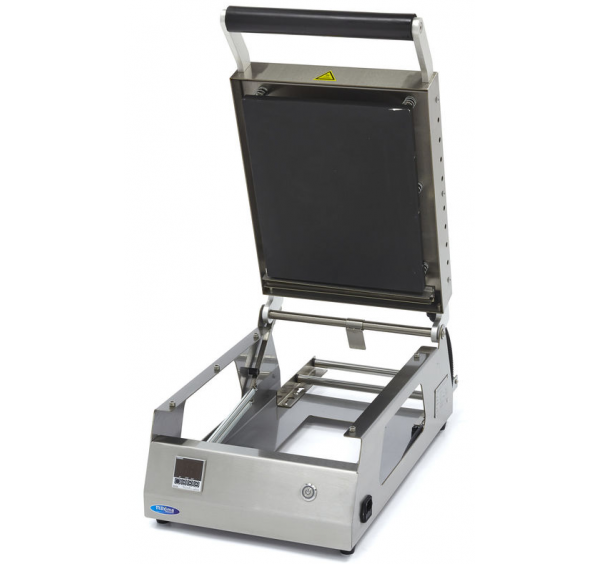 Manuális tálca lezáró - ételcsomagoló gép rozsdamentes acél burkolattal. Percenként kb 6-8 tálca lezárására alkalmas. Digitális vezérlő panellel. 2-5 másodperces hegesztési idő. Fólliatekercs tartóval a készülék hátoldalán. Állítható hegesztési hőmérséklet, max 180°C. (Ajánlott hőmérsékletek: PP: 150°C; CPET: 180°C) . Maximum 265mm széles fóliával használható. Maximális tálca magasság: 100mm. Használat előtt szükséges felfűtési idő: 10 perc. A készülék egy vagy többrekeszes tálcák lezárására alkalmas a megfelelő tálcazáró profil segítségével.