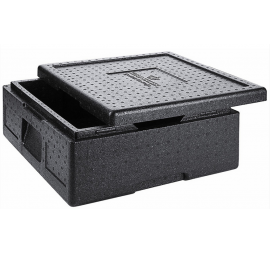 Fekete expandált polipropilénből készült, pizzaszállítódoboz, külső méretei, 41 x 41 x 18,5 cm, belső méretei 35 x 35 x 12 cm. A habosított polipropilén egy porózus anyag, széles körben használatos a különféle iparágakban. Tulajdonságai, könnyű és tartós. Energia elnyelő tulajdonsága révén széles körben alkalmazható, mindemellett kiváló hangszigetelő, hőszigetelő, az anyag 100%-ban újrahasznosítható, valamint kiváló víz záró tulajdonságokkal is bír.