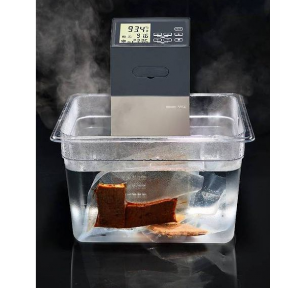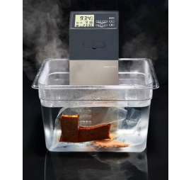 Sous-vide merülőfűtés, 1500W, 30 literes kapacitás. Univerzálisan, a legtöbb sík vagy kerek szélű hőálló edénnyel használható sous-vide merülő fűtőegység. 0,1°C-os lépésközökben szabályozható hőmérséklet, 99°C-ig. Magas pontosság: <0,1°C. Túlmelegedés elleni védelem. Beállítható főzési idő. Egyszerűen használható érintőgombos vezérlőpanel, digitális LCD kijelzővel. Egyenletes vízhőmérséklet köszönhetően a beépített vízpumpa rendszernek ( 8 liter/perc ) . Eltávolítható áramvezetékkel. Csendes üzemű, könnyen tisztítható sous-vide készülék. Alkalmankénti, mérsékelt igénybevételre tervezett készülék.