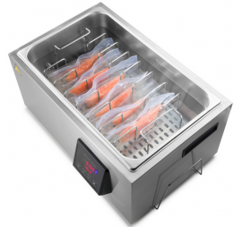Sous-vide gép, 28 literes medencével. 0,1°C-os lépésközökben szabályozható hőmérséklet, 99°C-ig. Magas pontosság: <0,1°C. Túlmelegedés elleni védelem. Beállítható főzési idő. Egyszerűen használható érintőgombos vezérlőpanel, digitális LCD kijelzővel. Egyenletes vízhőmérséklet köszönhetően a beépített vízpumpa rendszernek. Levehető fedél. Leeresztő csap. Alaptartozék rm.acél ráccsal a vákuumzacskózott ételekhez. Eltávolítható áramvezetékkel. Jól hőszigetelt, csendes üzemű, könnyen tisztítható sous-vide készülék. Alkalmankénti, mérsékelt igénybevételre tervezett készülék.
