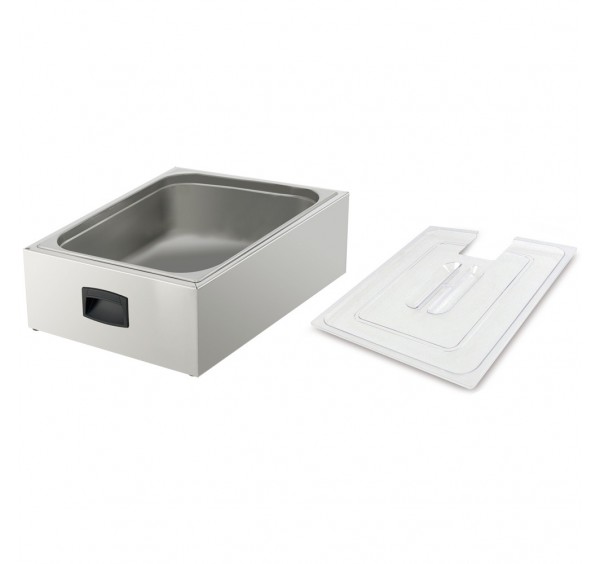 GN 2/1-200 mm méretű 50 literes hőszigetelt fogantyús fedeles rozsdamentes acél medencével.