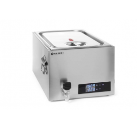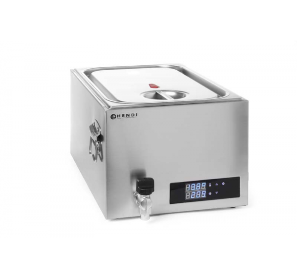 Rozsdamentes sous-vide alacsony hőmérsékletű, szabályozott lassú főzéshez, 20 literes medencével. Ideális például á la carte éttermeknek. Folyamatos, használatra alkalmas készülék.Elektronikus vezérlés nyomógombokkal. Digitális kijelző. A hőmérséklet 45-95°C között szabályozható, 0,1°C-os pontossággal. Rozsdamentes acélból készült univerzális kerettel, melynek segítségével 6 rekeszben helyezhetők el a vákuum zacskók.Szilikon tömítéssel ellátott hőszigetelő fedővel, amely nyomáscsökkentő szeleppel szerelt. Fogantyúkkal és leeresztőcsappal.
