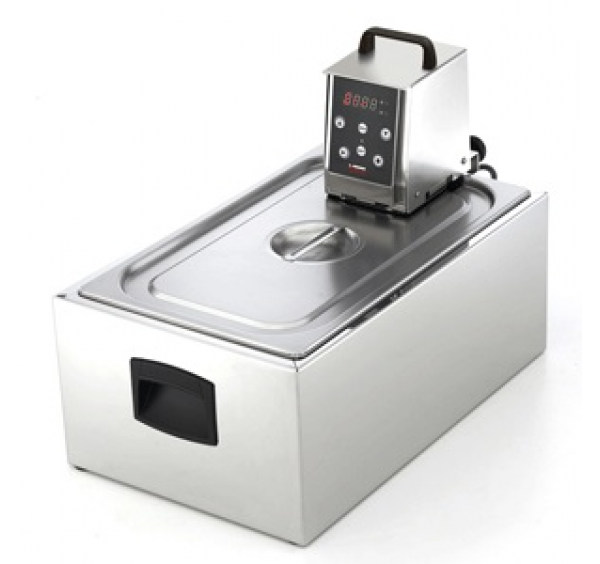 Sous vide konténer GN 1/1 méretben AISI 304 rozsdamentes acél kivitelben. Praktikus fogóval, a könnyű szállítás, valamint fedővel, az energiamegtakarítás érdekében. A kép csak illusztráció! A konténerhez tartozó softcooker egység külön vásárolható meg!