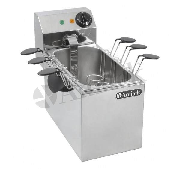 Elektromos üzemű tojásfőző rozsdamentes acél fedővel és 6 db főzőkosárral, 0-110°C közti hőmérsékletszabályozással.