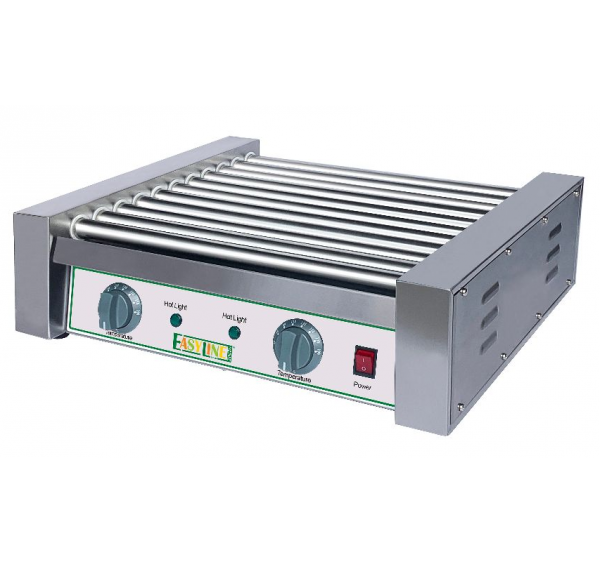 Forgóhengeres virslisütő, 11db Ø25 mm-es és 467 mm hosszúságú hengerrel, főkapcsolóval, 2 hőfokszabályozóval, 2 kontroll lámpával, rozsdamentes acél kivitelben. Gyors és egyenletes sütés a grillezésre jellemző ízt és színt adja a termékeknek anélkül, hogy kézzel kellene forgatni.