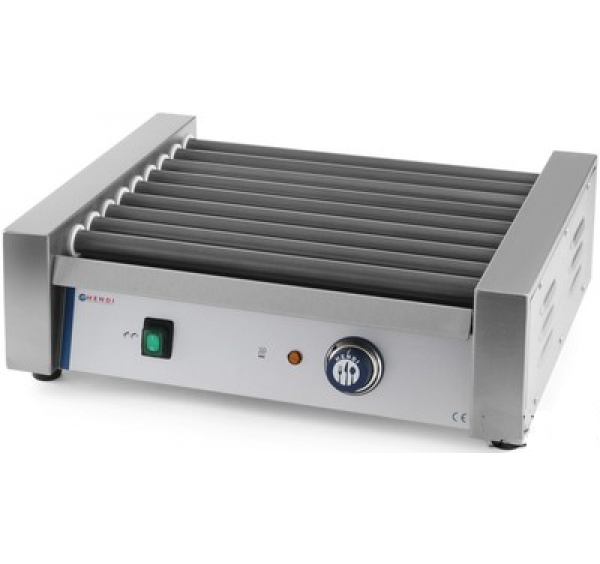 Forgóhengeres virslisütő, 9 hengerrel. Rozsdamentes acél ház. Tapadásmentes bevonatú sütőhengerek, 42cm hasznos hosszúsággal. Hőmérsékletszabályozás 150°C-ig. Gyors felmelegedés. A hengerek alatt kivehető és könnyen tisztítható tálca helyezkedik el. Ki-be kapcsoló gombbal, hőfokszabályozóval és kontrollámpával szerelve.