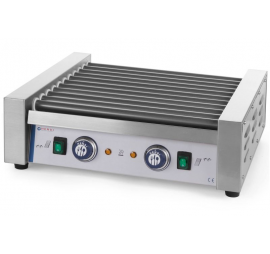Forgóhengeres virslisütő, 11 hengerrel. Rozsdamentes acél ház. Tapadásmentes bevonatú sütőhengerek, 42cm hasznos hosszúsággal. Hőmérsékletszabályozás 150°C-ig. Gyors felmelegedés. A hengerek alatt kivehető és könnyen tisztítható tálca helyezkedik el. Ki-be kapcsoló gombbal, hőfokszabályozóval és kontrollámpával szerelve.