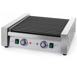 Forgóhengeres virslisütő, 14 hengerrel. Rozsdamentes acél ház. Tapadásmentes bevonatú sütőhengerek, 42cm hasznos hosszúsággal. Hőmérsékletszabályozás 150°C-ig. Gyors felmelegedés. A hengerek alatt kivehető és könnyen tisztítható tálca helyezkedik el. Ki-be kapcsoló gombbal, hőfokszabályozóval és kontrollámpával szerelve.