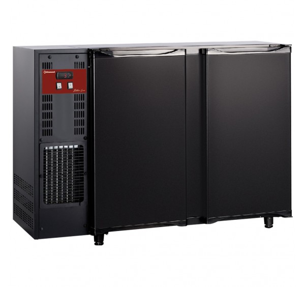 375 literes pult alá építhető hűtött bárbelső, bal oldali aggregáttal, ventilációs hűtéssel, környezetbarát R290 hűtőközeggel, 1120x430x737 mm-es belmérettel, 320 db üveg (0,33 l) vagy 420 db doboz (0,33l) elméleti kapacitással, kulccsal zárható 1 jobbra és 1 balra nyíló 510 mm szélességű 100°-nál megálló és önmagától visszazáródó teli ajtóval, felül süllyesztett fogantyúkkal, mágneses zárótömítéssel, ajtónként 2 db állítható magasságú 450x430 mm méretű rozsdamentes acél rácspolccal, kapcsolható led világítással, automatikus leolvasztással, digitális vezérléssel és kijelzéssel, +1/+8°C között szabályozható hűtési hőmérséklettel, 4. klímaosztályú (+30°C) és C energiaosztályú besorolással, 40 mm vastag CFC mentes poliuretán szigeteléssel, festett fehér belső és festett fekete acél külső burkolattal, 4 db 70 mm hosszú állítható magasságú lábbal (lábak nélkül csak 820 mm magas a készülék).