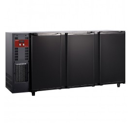 579 literes pult alá építhető hűtött bárbelső, bal oldali aggregáttal, ventilációs hűtéssel, környezetbarát R290 hűtőközeggel, 1730x430x737 mm-es belmérettel, 480 db üveg (0,33 l) vagy 630 db doboz (0,33l) elméleti kapacitással, kulccsal zárható 2 jobbra és 1 balra nyíló 510 mm szélességű 100°-nál megálló és önmagától visszazáródó teli ajtóval, felül süllyesztett fogantyúkkal, mágneses zárótömítéssel, ajtónként 2 db állítható magasságú 450x430 mm méretű rozsdamentes acél rácspolccal, kapcsolható led világítással, automatikus leolvasztással, digitális vezérléssel és kijelzéssel, +1/+8°C között szabályozható hűtési hőmérséklettel, 4. klímaosztályú (+30°C) és C energiaosztályú besorolással, 40 mm vastag CFC mentes poliuretán szigeteléssel, festett fehér belső és festett fekete acél külső burkolattal, 4 db 70 mm hosszú állítható magasságú lábbal (lábak nélkül csak 820 mm magas a készülék).
