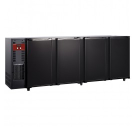 783 literes pult alá építhető hűtött bárbelső, bal oldali aggregáttal, ventilációs hűtéssel, környezetbarát R290 hűtőközeggel, 2340x430x737 mm-es belmérettel, 640 db üveg (0,33 l) vagy 840 db doboz (0,33l) elméleti kapacitással, kulccsal zárható 2 jobbra és 2 balra nyíló 510 mm szélességű 100°-nál megálló és önmagától visszazáródó teli ajtóval, felül süllyesztett fogantyúkkal, mágneses zárótömítéssel, ajtónként 2 db állítható magasságú 450x430 mm méretű rozsdamentes acél rácspolccal, kapcsolható led világítással, automatikus leolvasztással, digitális vezérléssel és kijelzéssel, +1/+8°C között szabályozható hűtési hőmérséklettel, 4. klímaosztályú (+30°C) és C energiaosztályú besorolással, 40 mm vastag CFC mentes poliuretán szigeteléssel, festett fehér belső és festett fekete acél külső burkolattal, 4 db 70 mm hosszú állítható magasságú lábbal (lábak nélkül csak 820 mm magas a készülék).