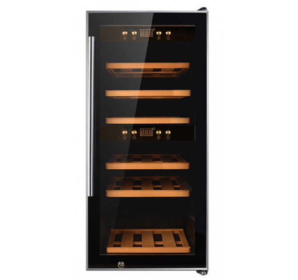 A kétszekciós, kompresszoros hűtésű borhűtő fekete oldalborítással, rozsdamentes, dupla és sötétített üvegezésű ajtóval, 2 különálló digitális hőfokkijelzővel, belső LED világítással, ventilátorral és zárral rendelkezik. Ez a borhűtő tökéletes választás vendéglátóhelyekre, mert kétszekciós kialakításának köszönhetően, akár különböző hűtési igényű borok és pezsgők is tárolhatók benne.