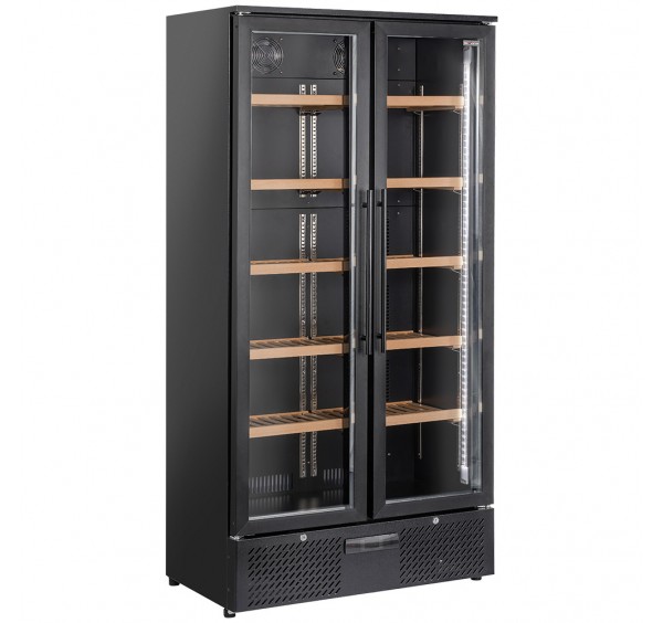 460 literes borhűtő, 1 hőmérsékleti zónával, ventilációs hűtéssel, 2 db fekete keretes kulccsal zárható üveg nyílóajtóval, ergonómikus ajtófogantyúkkal, 808x418x1490 mm-es belső mérettel, ajtónként 5-5 db fa polccal, belső világítással, +5/+14°C közti elektronikusan szabályozható hűtési hőmérséklettel, digitális kijelzéssel, B energiaosztályú besorolással, kívül-belül fekete festett acél burkolattal
