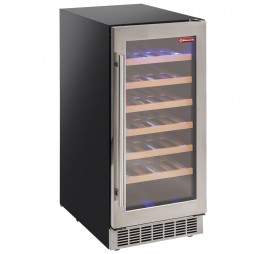 106 literes borhűtő beépítési lehetőséggel, 1 hőmérsékleti zónával, ventilációs hűtéssel (39 dbA), környezetbarát R600a hűtőközeggel, rozsdamentes acél keretes kétrétegű hőszigetelt UV-szűrős üvegajtóval, rozsdamentes acél fogantyúval, megfordítható ajtónyitódással, mágneses zárótömítéssel, 34 palack (0,75 l) elméleti kapacitással, 6 db kihúzható fa polccal, belső kék led világítással, aktív szénszűrővel, elektronikusan szabályozható hűtési hőmérséklettel, digitális kijelzővel, 4. klímaosztályú (+30°C) és F energiaosztályú besorolással, automatikus leolvasztással, CFC mentes poliuretán szigeteléssel (35 mm), belül műanyag, kívül fekete festett acél burkolattal, szintezhető talpakkal