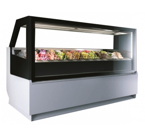 A 24 tégelyes fagylaltpult beépített aggregáttal, elektronikus leolvasztással (meleggázos leolvasztás), olvadékvíz elpárologtatással, digitális termosztáttal, hidraulikus nyitású frontüveggel, rozsdamentes munkafelülettel, függőleges LED világítással rendelkezik. A hűtőtérben plusz tégelyek tárolhatók. Szürke vagy fekete üvegkerettel.