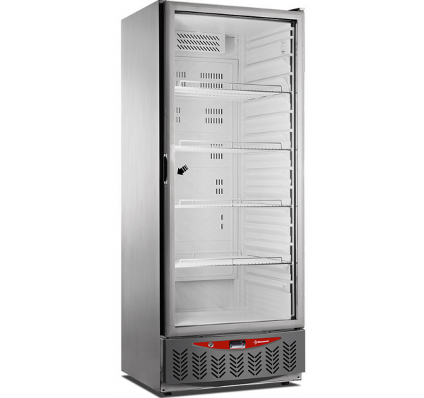 525 literes hűtőszekrény, alsó aggregáttal, ventilációs hűtéssel, környezetbarát R600a hűtőközeggel, zárható üveg ajtóval, 650x538x1480 mm-es belmérettel, 4 db GN 2/1 méretű állítható magasságú rácspolccal, beépített led világítással, lekerekített belső sarkokkal, megfordítható ajtónyitódással, cserélhető mágneses zárótömítéssel, süllyesztett fogantyúval, nyitásérzékelő mikrokapcsolóval, 90°-tól önmagától visszacsukódó ajtóval, 1/+8°C között elektronikusan szabályozható hűtési hőmérséklettel és digitális kijelzéssel, 4. klímaosztályú (+30°C) és C energiaosztályú besorolással, automatikus leolvasztással, CFC mentes 60 mm vastag poliuretán szigeteléssel, belül fehér egy darabból öntött műanyag, kívül rozsdamentes acél burkolattal, 4 db görgővel és 2 db szintezhető talppal, "Side by Side" elhelyezésre alkalmas kialakítással.