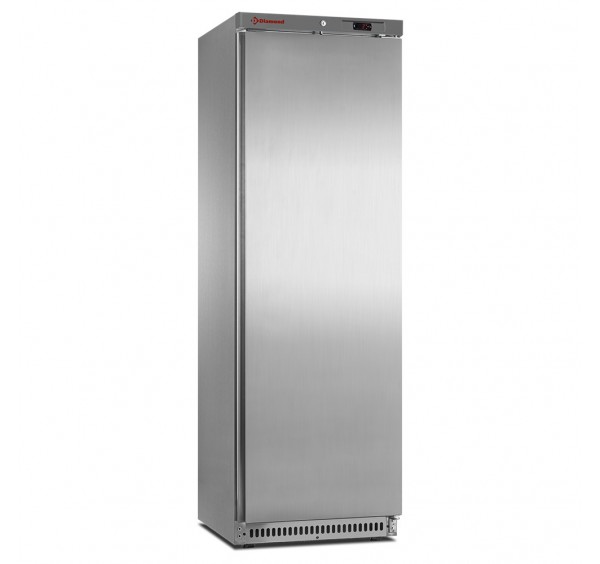400 literes hűtőszekrény, alsó aggregáttal, ventilációs hűtéssel, környezetbarát R600a hűtőközeggel, zárható teli ajtóval, 477x470x1590 mm-es belmérettel, 4 db 495x428 mm méretű állítható magasságú műanyag bevonatú acél rácspolccal, lekerekített belső sarkokkal, megfordítható ajtónyitódással, cserélhető mágneses zárótömítéssel, süllyesztett fogantyúval, nyitásérzékelő mikrokapcsolóval, 90°-tól önmagától visszacsukódó ajtóval, +1/+8°C között elektronikusan szabályozható hűtési hőmérséklettel és digitális kijelzéssel, 4. klímaosztályú (+30°C) és D energiaosztályú besorolással, automatikus leolvasztással, CFC mentes 50 mm vastag poliuretán szigeteléssel, belül fehér öntött műanyag, kívül rozsdamentes acél burkolattal, 4 db görgővel és 2 db szintezhető talppal, "Side by Side" elhelyezésre alkalmas kialakítással