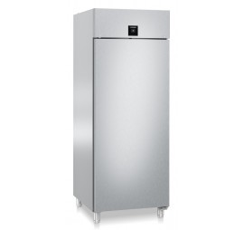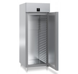 Teli ajtós pék, cukrász, sütőipari hűtőszekrény (DIN EN 16825:2015 és EN 60335 szabvány megfelelőség); dupla ventilátoros légbefúvásos hűtési rendszerrel; felső léghűtéses aggregáttal; zárható teli ajtóval; kapcsolható bal oldali LED világítással (teljes magasságban); LightAlarm: riasztás fényjelzéssel; HumidityControl: 3 fokozatban állítható páratartalom; SuperCool funkció; 2,4" színes, Touch&Swipe érintőkijelzővel; digitális hőmérsékletkijelzéssel; testreszabható optikai és akusztikus riasztási funkciókkal: eltérő hőmérséklet, ajtó nyitva maradás és áramkimaradás esetén, az áramellátás helyreállásával; integrált adatmemória: elmúlt időszak (kb. 42 nap) min/max. hőmérsékleti értékeinek eltárolása és kijelzőn történő megjelenítése; integrált SmartModule: WiFi/Lan interfész adattovábbításhoz (SmartMonitoring); billentyűzárral; nyomáskiegyenlítő szeleppel; rozsdamentes acél (1.4301 / AISI 304) külső burkolattal; rozsdamentes acél (1.4301 / AISI 304) belső burkolattel; padlólefolyó tisztító nyílás; IPX5 szabvány szerinti külső és belső védelem; kivehető, rozsdamentes acél (1.4301 / AISI 304) síntartó lécek; 20 db állítható "L" alakú, 600×800 mm méretű rozsdamentes acél (1.4301 / AISI 304) tepsitaró sínpárral; síntávolság: 27,5 mm; polconkénti terhelhetőség: max. 60 kg; az ajtó 90°-os nyitási szög felett nyitva marad, ez alatt önműködően csukódik és nyitásának iránya megfordítható; higiénikus, cserélhető ajtószigeteléssel; ajtóprofilba süllyesztett fogantyúval; automatikus - szükségvezérelt és manuálisan is indítható - forrógázos leolvasztással; rozsdamentes acél 115-175 mm között állítható lábakkal; FCKW-FKW mentes hűtőközeg (R 290) és falszigetelés (83 mm); külső hőmérséklet: +10/+40°C között - 5. klímaosztály; BFPSvh 8401 mélyhűtővel párba állítható; éves energiafogyasztás: 371 kWh; A energiahatékonysági osztály