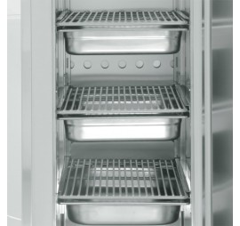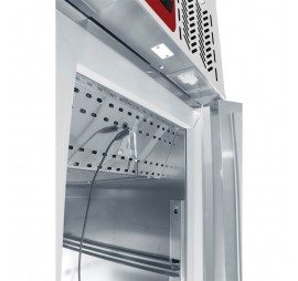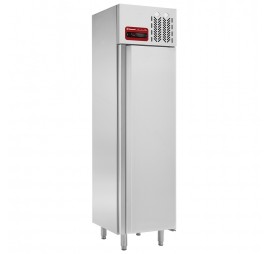 Kombinált sokkoló hűtő és hűtőszekrény egyben keskeny helytakarékos kivitelben, felső aggregáttal, R290 hűtőközeggel, 16x GN 1/1 hűtési kapacitással vagy 5x GN 1/1 sokkoló hűtő kapacitással, lehűtési ciklus +70°C-ról +3°C-ra 90 perc alatt 20 kg, 5 pár dupla kialakítású "E" tálcatartó sínnel és 3 db GN 1/1-es rácspolccal, beépített maghőmérővel, digitális vezérléssel és kijelzéssel, riasztás funkcióval, 100°-tól önmagától visszazáródó megfordítható nyitódású ajtóval, süllyesztett ajtófogantyúval, könnyen cserélhető mágneses zárótömítéssel, ajtókeret fűtéssel, nyitásérzékelő mikrokapcsolóval, lekerekített sarkokkal, hűtési hőmérséklet: 0/+8°C vagy +70/+3°C között, 80 mm vastag CFC mentes szigeteléssel, 4-es klímaosztályú besorolással (+30°C), manuális vagy automata leolvasztással, kívül-belül rozsdamentes acél burkolattal, 4 db rozsdamentes acél lábbal, HACCP előírásoknak megfelelő kivitelben.