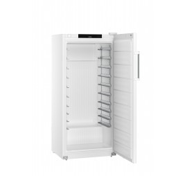 Teli ajtós sütőipari, cukrászati mélyhűtő szekrény statikus (SmartFrost - szigetelésbe habosított elpárologtató - technológia) hűtési rendszer; zárható teli ajtó; hűtési tartomány: -9/-26°C között; SuperFrost funkció; ajtóba integrált érintőgombos monokróm kijelző; digitális hőmérsékletkijelzés; optikai és akusztikus riasztási funkciók: eltérő hőmérséklet, ajtó nyitva maradás és áramkimaradás esetén, az áramellátás helyreállásával; integrált adatmemória: elmúlt időszak (kb. 42 nap) min/max. hőmérsékleti értékeinek eltárolása és kijelzőn történő megjelenítése; billentyűzár funkció; nyomáskiegyenlítő szelep; keretfűtés; kívül fehér színű porszórt acél burkolat; egy darabból készült, hőformázott, fehér színű polisztirol (környezetbarát) belső burkolat; 10 db állítható "L" alakú, 600x400 mm méretű rozsdamentes acél tepsitartó sínpár; polconkénti terhelhetőség: max. 60 kg; síntávolság: 25 mm; az ajtó 90°-os nyitási szög felett nyitva marad, ez alatt önműködően csukódik és nyitásának iránya megfordítható; higiénikus, cserélhető ajtószigetelés; ergonomikus alumínium fogantyú; manuális leolvasztás; szintező talpak; FCKW-FKW mentes hűtőközeg (R 290) és falszigetelés (63 mm); külső hőmérséklet: +10/+40°C között - 7. klímaosztály; BRFvg 5501 és BRFvg 5511 hűtővel párba állítható; éves energiafogyasztás: 1241 kWh