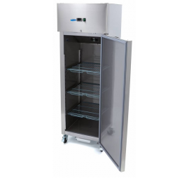 Kívül belül rozsdamentes acél mélyhűtő szekrény 3 db állítható magasságú polccal, elektronikus hőmérséklet-szabályozással és digitális termosztáttal, belső LED világítással, zárható önzáródó ajtóval, antibakteriális ajtótömítéssel, lekerekített sarkokkal, 4 db bolygókerékkel - ebből 2 fékezhető.