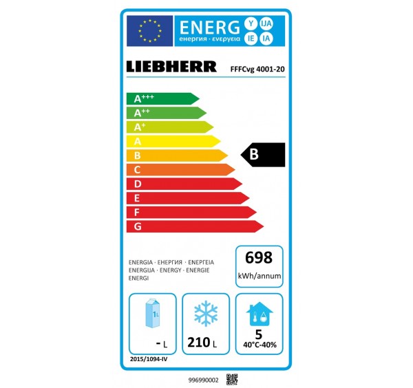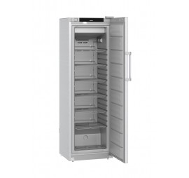 Mélyhűtő szekrény (DIN EN 16825:2015 és EN 60335 szabvány megfelelőség); ventilációs hűtési rendszerrel (NoFrost technológia); zárható teli ajtóval; kapcsolható felső LED világítással; LightAlarm: riasztás fényjelzéssel; hűtési tartomány: -9/-26°C között; SuperFrost funkcióval; ajtóba integrált érintőgombos monokróm kijelzővel; digitális hőmérsékletkijelzéssel; optikai és akusztikus riasztási funkciókkal: eltérő hőmérséklet, ajtó nyitva maradás és áramkimaradás esetén, az áramellátás helyreállásával; integrált adatmemória: elmúlt időszak (kb. 42 nap) min/max. hőmérsékleti értékeinek eltárolása és kijelzőn történő megjelenítése; SmartModule kompatibilis (opcionális tartozék); integrált WiFi/Lan interfész adattovábbításhoz (SmartMonitoring); billentyűzár funkcióval; nyomáskiegyenlítő szeleppel; keretfűtéssel; kívül rozsdamentes acél burkolattal; egy darabból készült, hőformázott, szürke színű polisztirol (környezetbarát) belső burkolattal; 6 db megerősített, 420x400 mm méretű, szürke színű védőbevonatos acél rácspolccal, STOP funkcióval; polconkénti terhelhetőség: max. 45 kg; a polcok magassága 75 mm-ként állítható; padlórács; az ajtó 90°-os nyitási szög felett nyitva marad, ez alatt önműködően csukódik és nyitásának iránya megfordítható; higiénikus, cserélhető ajtószigeteléssel; ergonomikus alumínium fogantyúval; automatikus - szükségvezérelt és manuálisan is indítható - leolvasztással; szintező talpakkal; FCKW-FKW mentes hűtőközeggel (R 600a) és falszigeteléssel (67 mm); külső hőmérséklet: +10/+40°C között állítható - 5. klímaosztály; FRFCvg 4001 hűtővel párba állítható; éves energiafogyasztás: 803 kWh; B energiahatékonysági osztály.