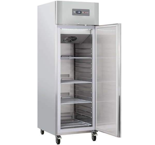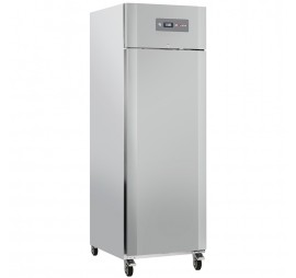 600 literes mélyhűtőszekrény, felső aggregáttal, ventilációs hűtéssel, környezetbarát R290 hűtőközeggel, GN 2/1 belmérettel, 3 db 530x650 mm méretű rácspolccal és 1 db padlóráccsal, megfordítható nyitódású önmagától visszacsukódó kulccsal zárható teli ajtóval, ergonómikus kialakítású süllyesztett hosszanti fogantyúval, könnyen cserélhető mágneses zárótömítéssel, nyitásérzékelő mikrokapcsolóval, belső led világítással, lekerekített belső sarkokkal, -22/-18°C között elektronikusan szabályozható hűtési hőmérséklettel, digitális kijelzéssel, 4. klímaosztályú (+30°C) és D energiaosztályú besorolással, automatikus leolvasztással (programozható), CFC mentes 80 mm vastag poliuretán szigeteléssel, kívül-belül rozsdamentes acél burkolattal, 4 db kerékkel melyből 2 fékezhető