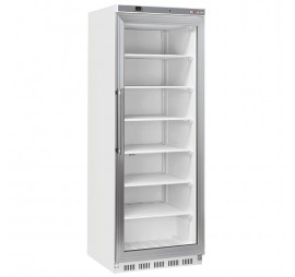 400 literes mélyhűtőszekrény, statikus hűtéssel, környezetbarát R290 hűtőközeggel, alumínium keretes zárható üvegajtóval, 6 db fehér fix hűtött rácspolccal, mágneses zárótömítéssel, ergonómikus kialakítású rozsdamentes acél ajtófogantyúval, belső led világítással, -20/-15°C között elektronikusan szabályozható hűtési hőmérséklettel, digitális kijelzéssel, 3. klímaosztályú (+25°C) és B energiaosztályú besorolással, manuális leolvasztással, CFC mentes 65 mm-es poliuretán szigeteléssel, belül fehér öntött műanyag, kívül fehér színű acél burkolattal, szintezhető talpakkal