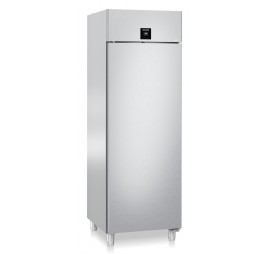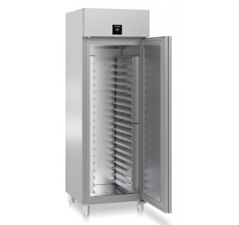 Teli ajtós pék, cukrász, sütőipari mélyhűtő szekrény (DIN EN 16825:2015 és EN 60335 szabvány megfelelőség); dupla ventilátoros légbefúvásos hűtési rendszerrel; felső léghűtéses aggregáttal; zárható teli ajtóval; kapcsolható bal oldali LED világítással (teljes magasságban); LightAlarm: riasztás fényjelzéssel; SuperFrost funkció; 2,4" színes, Touch&Swipe érintőkijelzővel; digitális hőmérsékletkijelzéssel; testreszabható optikai és akusztikus riasztási funkciókkal: eltérő hőmérséklet, ajtó nyitva maradás és áramkimaradás esetén, az áramellátás helyreállásával; integrált adatmemória: elmúlt időszak (kb. 42 nap) min/max. hőmérsékleti értékeinek eltárolása és kijelzőn történő megjelenítése; integrált SmartModule: WiFi/Lan interfész adattovábbításhoz (SmartMonitoring); billentyűzárral; nyomáskiegyenlítő szeleppel; rozsdamentes acél (1.4301 / AISI 304) külső burkolattal; rozsdamentes acél (1.4301 / AISI 304) belső burkolattal; padlólefolyó tisztító nyílással; IPX5 szabvány szerinti külső és belső védelemmel; kivehető, rozsdamentes acél (1.4301 / AISI 304) síntartó lécekkel; 20 db állítható "L" alakú, 400×600 mm méretű rozsdamentes acél (1.4301 / AISI 304) tepsitaró sínpárral; síntávolság: 27,5 mm; polconkénti terhelhetőség: max. 60 kg; az ajtó 90°-os nyitási szög felett nyitva marad, ez alatt önműködően csukódik és nyitásának iránya megfordítható; higiénikus, cserélhető ajtószigetelés; ajtóprofilba süllyesztett fogantyúval; automatikus - szükségvezérelt és manuálisan is indítható - forrógázos leolvasztással; rozsdamentes acél 115-175 mm között állítható lábakkal; FCKW-FKW mentes hűtőközeg (R 290) és falszigetelés (83 mm); külső hőmérséklet: +10/+40°C között - 5. klímaosztály; BRPSvh 6501 hűtővel párba állítható; éves energiafogyasztás: 1150 kWh; B energiahatékonysági osztály