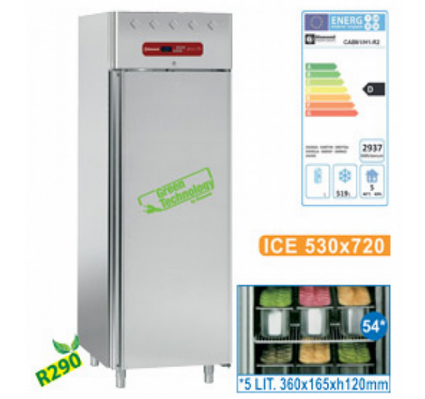 Bruttó 700 literes mélyhűtő szekrény kifejezetten fagylalt hűtésére, felső aggregáttal, ventilációs hűtéssel, környezetbarát R290 hűtőközeggel, 1 zárható teli ajtóval, 5 db 530x720 mm méretű polccal, 54 db 360x165x120 mm méretű (5 literes) fagyis tégely kapacitással, digitális vezérléssel és kék ledes kijelzővel, kapcsolható belső világítással, automatikus leolvasztással, ajtókeret fűtéssel, nyomáskiegyenlítő szeleppel, 100°-nál megálló és önmagától visszazáródó ajtóval, ergonómikus kialakítású süllyesztett hosszanti fogantyúval, megfordítható ajtónyitási iránnyal, cserélhető mágneses zárótömítéssel, nyitásérzékelő mikrokapcsolóval, lekerekített belső sarkokkal, 75 mm vastagságú CFC mentes poliuretán szigeteléssel, kívül-belül rozsdamentes acél burkolattal (galvanizált acél hátlappal), 4 db állítható magasságú acél lábbal, -10/-25°C között szabályozható hűtési hőmérséklettel, 5. klímaosztályú (+40°C) és D energiaosztályú besorolással, fagylaltos tégelyek nélkül szállítva! Ideális büfék, éttermek, szállodák, cukrászdák, üzemi konyhák, közintézmények és vendéglátóegységek kiszolgálására!