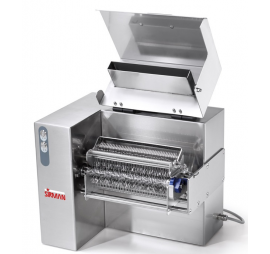 Húsrostlazító (tenderizáló), rozsdamentes acél géptesttel, marhahúshoz és halhoz használható hengerrel, kezelőgombbal, könnyen eltávolítható fedéllel van felszerelve, így könnyebben tisztítható. Nagy betöltő nyilással rendelkezik. 10 vagy 15 mm-es tenderizer kés/penge illik hozzá. A penge sín könnyen eltávolítható és cserélhető.