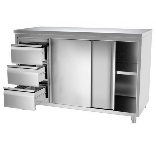 140x70 cm-es rozsdamentes semleges pult tolóajtóval és 3 fiókkal