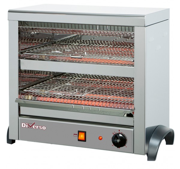 elektromos üzemű 2 szintes toaster, szintenkénti 380x250x63 mm-es belső mérettel, 2x3 db csipeszes sütőrostéllyal, alul-középen-felül 2-2 db ráccsal védett kvarz fűtőbetéttel, sütőszint választási lehetőséggel, 0-15 perces időzítővel, kontroll lámpával, kihúzható morzsatálcával, rozsdamentes acél burkolattal