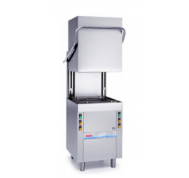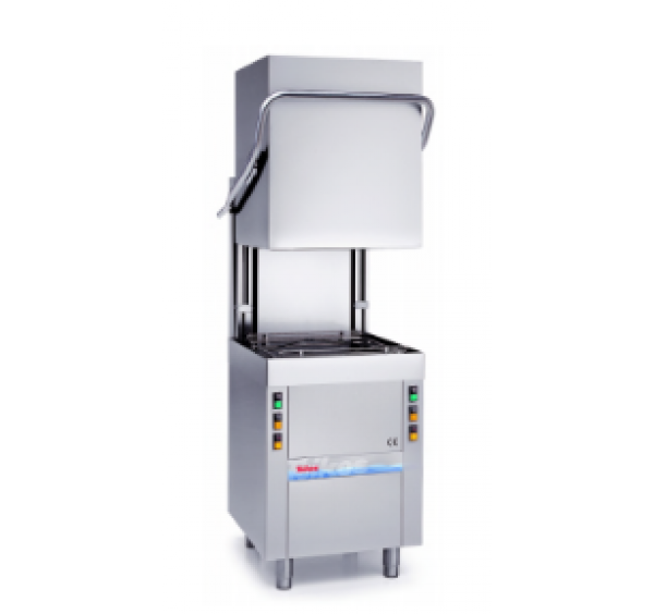 Átfutó rendszerű, duplafalú, gravitációs tányér- és pohármosogató gép rozsdamentes acél burkolattal, szintezhető lábakkal, alul-felül rozsdamentes forgó mosó, és öblítőfejekkel, öblítő- és