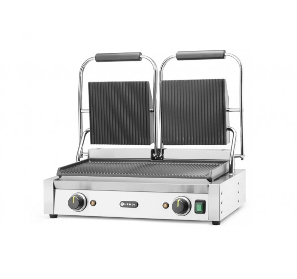 2 zónás 2 fedlapos kontaktgrill alul-felül bordázott öntöttvas sütőfelülettel