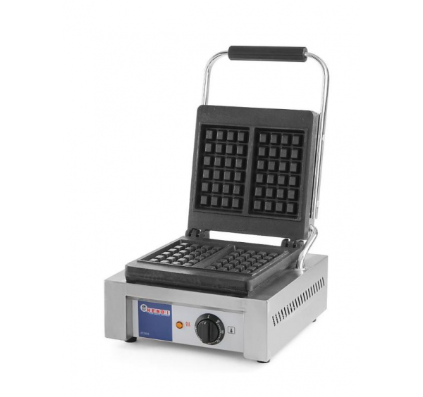 Ipari gofrisütő (waffelsütő), "LIÉGE" sütőformával. Rozsdamentes acél szerkezet, tapadásmentes bevonatú öntöttvas sütőforma. Hőszigetelt fogantyúval, hőmérséklet szabályzóval, kontrollámpával. Tartozék gofrifelszedő villa segédeszközzel. Kettő darab 6x4 kockás 'LIÉGE" típusú gofri készítésére alkalmas. Nyitott magassága 650mm.