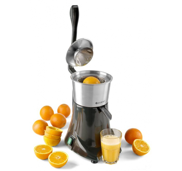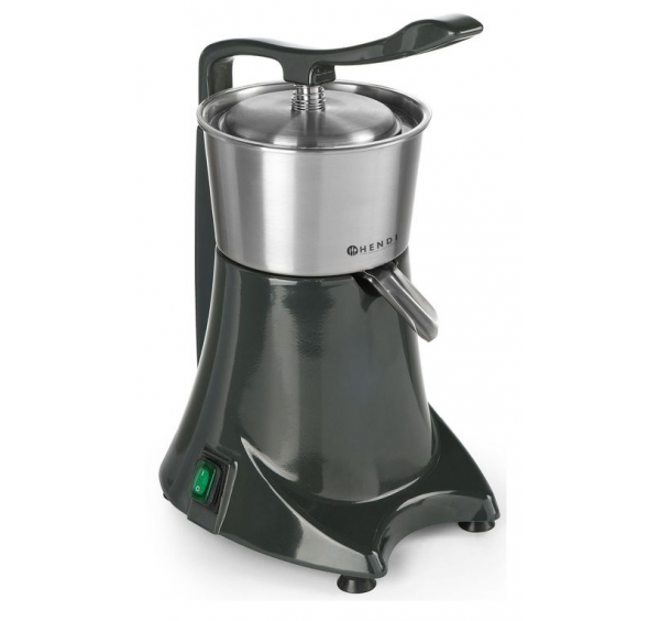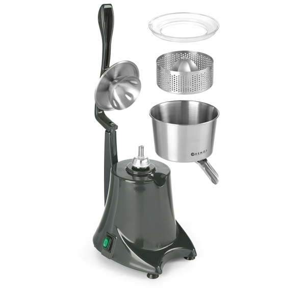 Elektromos citrusfacsaró leszorító tetővel. Festett alumínium géptest, rozsdamentes acél facsaró szerkezettel. Eltávolítható facsaró kúp és edény. Fogantyús leszorító tetővel a biztonságos üzemeltetéshez.
