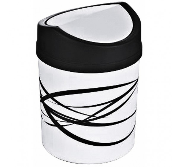 Fehér polipropilén műanyagból készült asztaliszemetes fekete mintával, lengő fedél..