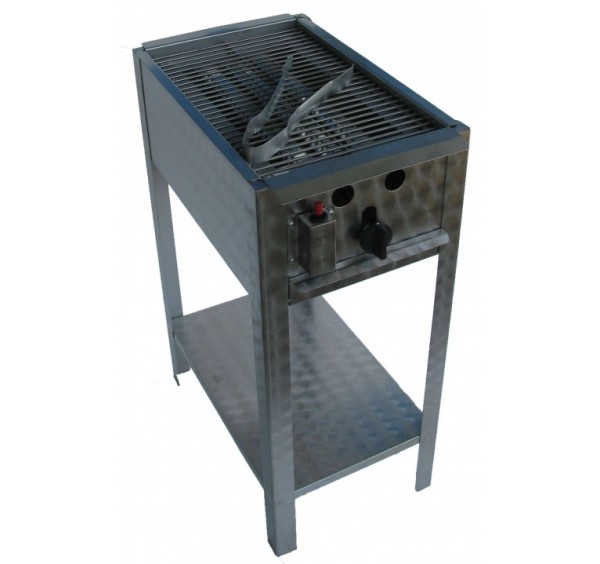 Mobil felhasználásra kiválóan alkalmas gázüzemű grillező készülék, komplett rozsdamentes burkolattal, álló kivitelben. Grillezhet kolbászt, szelet húsokat, zöldségeket otthon az erkélyen, a kertjében, vagy akár szabadtéri rendezvényeken is.Piezzoval, thermoelektromos égésbiztosítóval felszerelt rozsdamentes szerkezet. Krómozott rostélyrács. 1 szabályozható sütőzóna. Zsírfelfogó tálcával, nemesacél lángvédő burkolattal, nemesacél fogóval.
