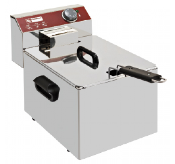 Asztali elektromos üzemű 7 literes fritőz fedővel, 1x +/- 6,5 literes medence kapacitással, rozsdamentes acél sütőkosárral, hideg zónával, kiemelhető fűtőegységgel, főkapcsoló nélkül, 0-180°C közti mechanikus hőfokszabályozással, hőszigetelt fogantyúkkal, kívül-belül rozsdamentes acél kivitelben.