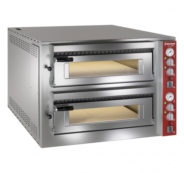 elektromos üzemű 2 aknás pizzasütő, 2x6 db 350 mm átmérőjű pizza kapacitással, 2x 700x1050x150 mm belméretű sütőtérrrel, hőkicsapódást csökkentő rozsdamentes acél íves felső aknakialakítással, üvegbetétes és hőszigetelt fogantyús sütőajtóval, galvanizált acél aknabelsővel és alul samot béléssel, beépített belső világítással, főkapcsolóval, biztonsági termosztáttal, 50-450˚C közti mechanikus hőfokszabályozással, analóg hőmérsékletkijelzéssel, rozsdamentes acél fronttal, pultra helyezhető és egymásra rakható kivitelben (2 db - 6+6 és 6)