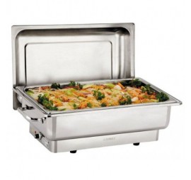 Elektromos chafing GN 1/1 komplett, fedővel és fedő tartóval. 1 db GN 1/1-es 100 mm mély edénnyel 13,5 L. Hőfokszabályzóval, max. 90°C-ig. Kontroll lámpával, túlmelegedés elleni védelemmel. Súlya 9,5 kg, méretei 650 x 380 x 350 mm. Az elektromos fűtés teljesítménye 230V - 1 KW. Étel melegentartó és tálalóedény. Az elkészített ételeket melegen tartja. A reggeliztetés, a rendezvények, az éttermek elengedhetetlen terméke. Ideális éttermek, szállodák, pizzériák, cukrászdák, ipari konyhák és vendéglátóegységek kiszolgálására!