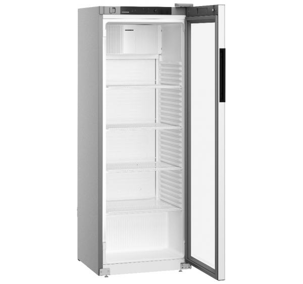 Üvegajtós hűtőszekrény ventilációs hűtési rendszerrel, automatikus leolvasztással, zárható SwingLine hőszigetelt üvegajtóval (ESG biztonsági üveg), kapcsolható oldalsó LED világítással (teljes magasságban, mechanikus vezérléssel, digitális hőmérsékletkijelzéssel, kívül szürke színű porszórt acél burkolattal, egy darabból öntött polisztirol (környezetbarát) belső burkolattal, 4 db fehér színű védőbevonatos megerősített acél rácspolccal, STOP funkcióval és leesésgátlóval. A polcok magassága 35 mm-ként állítható. Polconkénti terhelhetőség: max. 45 kg. Kapacitás: 414 db 0,33l aludoboz (facing: 7), 207 db 0,5l PET (facing: 7), 102 db 1l PET (facing: 7), 80 db 1,5l PET palack (facing: 7). Az ajtó önműködően csukódik (90°-tól nyitva marad) és nyitásának iránya megfordítható. Higiénikus, cserélhető ajtószigeteléssel, ajtóprofilba süllyesztett fogantyúval, 1 pár első vízszintező talppal, FCKW-FKW mentes hűtőközeggel (R 600a) és falszigeteléssel (50 mm). Külső hőmérséklet: +10/+40°C között - CC2 klímaosztály. Éves energiafogyasztás: 531,86 kWh. C energiahatékonysági osztály.