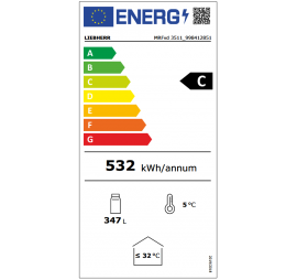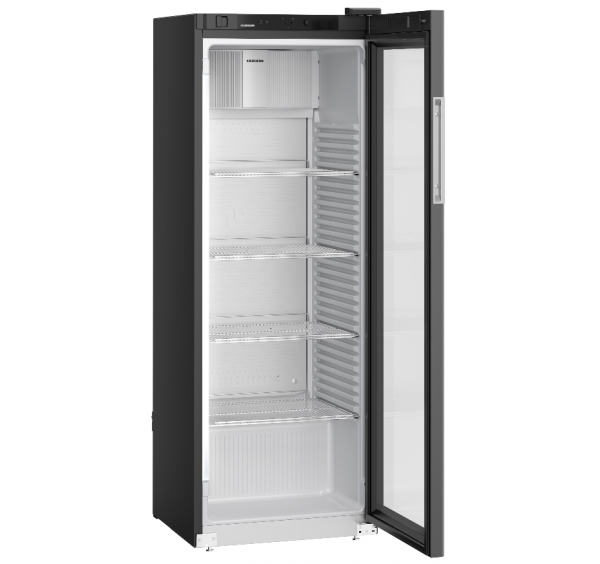 Üvegajtós hűtőszekrény ventilációs hűtési rendszerrel, automatikus leolvasztással, zárható SwingLine hőszigetelt üvegajtóval, kapcsolható oldalsó LED világítással (teljes magasságban), mechanikus vezérléssel, digitális hőmérsékletkijelzéssel, kívül fekete színű porszórt acél burkolattal, egy darabból öntött szürke színű polisztirol (környezetbarát) belső burkolattal, 4 db átlátszó védőbevonatos megerősített acél rácspolccal, STOP funkcióval és leesésgátlóval. A polcok magassága 35 mm-ként állítható. Polconkénti terhelhetőség: max. 45 kg. Kapacitás:414 db 0,33l aludoboz (facing: 7), 207 db 0,5l PET (facing: 7), 102 db 1l PET (facing: 7), 80 db 1,5l PET palack (facing: 7). Az ajtó önműködően csukódik (90°-tól nyitva marad). Az ajtó nyitásának iránya megfordítható. Higiénikus, cserélhető ajtószigeteléssel, ajtóprofilba süllyesztett fogantyúval, 1 pár első vízszintező talppal, FCKW-FKW mentes hűtőközeggel (R 600a) és falszigeteléssel (50 mm). Külső hőmérséklet: +10/+40°C között - CC2 klímaosztály. Éves energiafogyasztás: 531,86 kWh. C energiahatékonysági osztály.