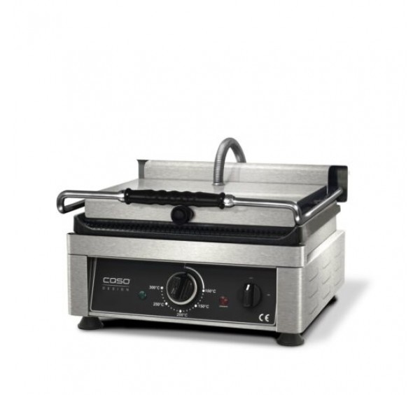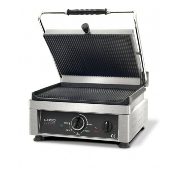 Az alul-felül bordázott grillfelület tartós öntöttvasból készült, rozsdamentes acél ház, rozsdamentes acél zsírgyűjtő tálca, ergonomikus hőszigetelt fogantyú