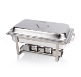 GN1/1 méretű, az alábbiakat tartalmazza: 1 db GN1/1 65 mm-es edény fedővel, vízmelegítő medence, keret, 2 db pasztatartó, az égőpaszta nem tartozék, anyaga: rozsdamentes acél.