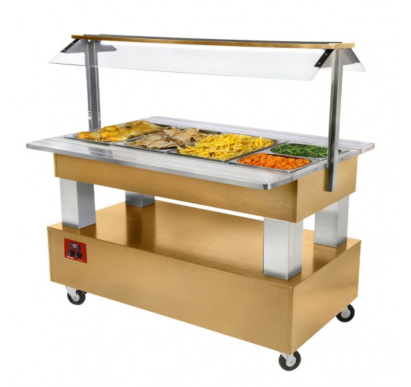 vízfürdős melegentartó büfékocsi térben álló kivitelben, 4x GN 1/1 - 150 mm kapacitással, felső polcos üveg leheletvédő felépítménnyel, beépített felső led világítással, rozsdamentes acél medencével, leeresztő csappal, digitális kijelzéssel és +20/+90°C közti hőmérsékletszabályozással, alsó nyitott tárolórésszel, pultfelületen 2 oldalon lehajtható tálcacsúsztatókkal, világos tölgyfa színű burkolattal, CFC mentes poliuretán szigeteléssel, 4 önbeálló kerékkel (2 fékezhető),