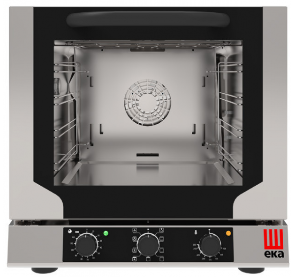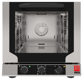 Légkeveréses látványsütő, multifunkciós, 4x 429*345mm tálcás. 4db tálca befogadására alkalmas tartó sínnel (74mm síntáv). Rozsdamentes nemesacél külső és belső burkolat. Manuális időkapcsolóval és hőmérséklet szabályzóval. Hőmérséklet szabályozás 100-260°C között. Felső grill fűtőelemmel. Multifunkciós: Többféle szabályozható sütési beállítás és ventiláció választható (hagyományos statikus sütés, légkeveréses/konvekciós sütés, grill funkció, eltérő alsó/felső hőmérséklet, kiolvasztás). Előre billenthető sütőajtóval. Az ajtó alatt vízszintesen elhelyezett kezelőpanellel. Tartozék: 4db alumínium sütőtepsi. IPX3 fröccsenő víz elleni védelemmel. Párásító funkció nélkül. Mirelit és friss péktermékek készre sütésére ajánlott látványsütő berendezés. Dugvilla nélkül szállítva.