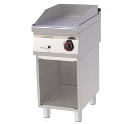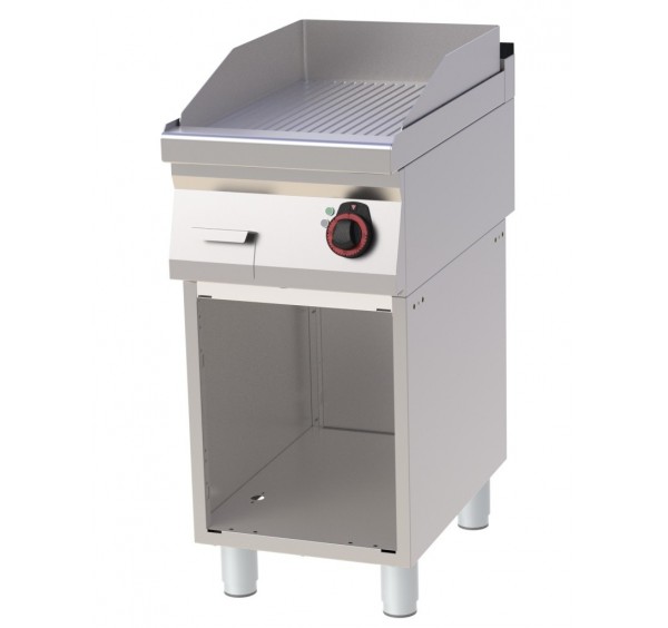 Rozsdamentes burkolat, lekerekített élek, 12 mm vastag bordázott, öntöttvas sütőfelület, zsírgyűjtőfiók.